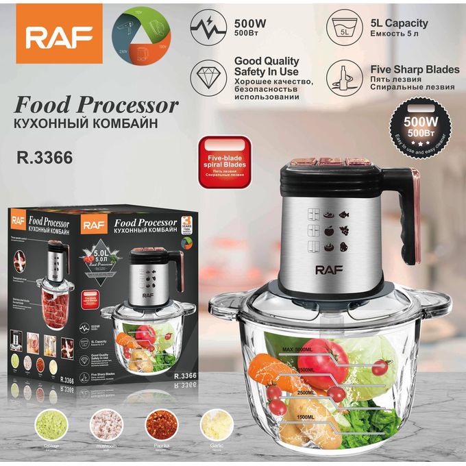 Make food preparation easier with the RAF Glass Chopper with Handle. Powered by a 1000-watt motor and a 5-liter capacity, it is perfect for chopping and grinding vegetables, fruits, and meat efficiently. The transparent glass bowl allows you to monitor the process easily, while the sturdy handle ensures convenient use.