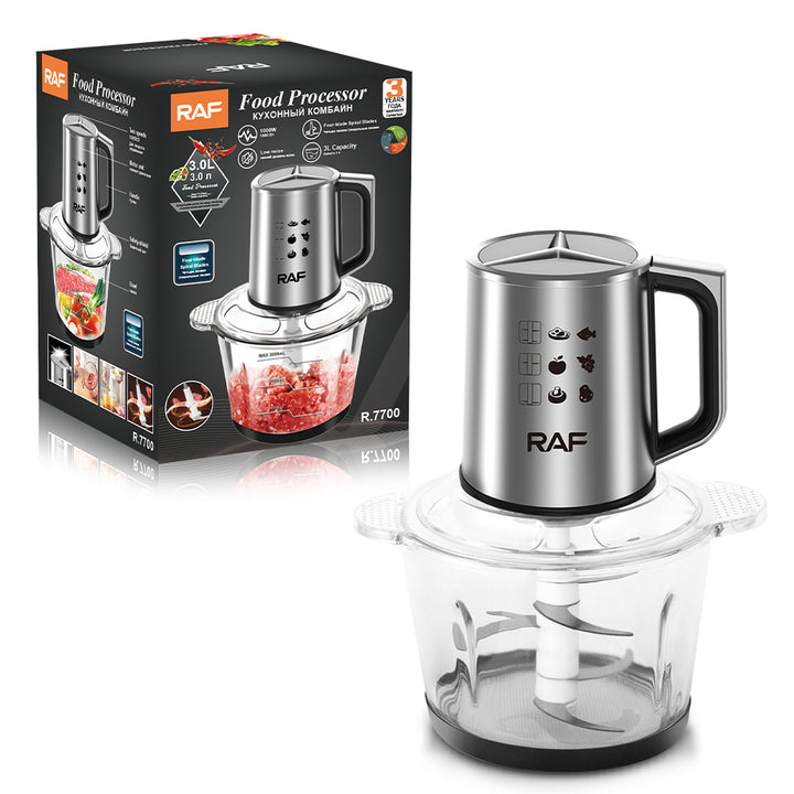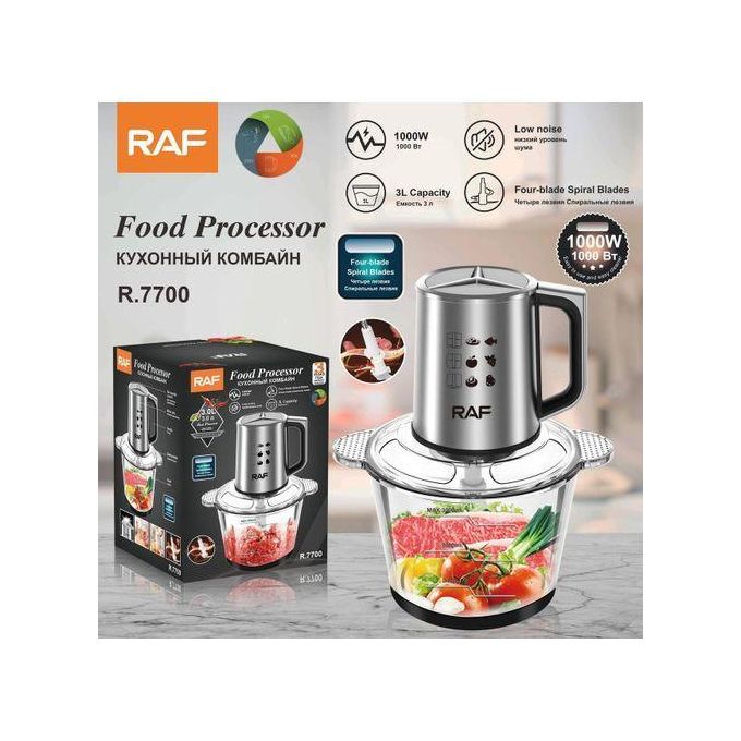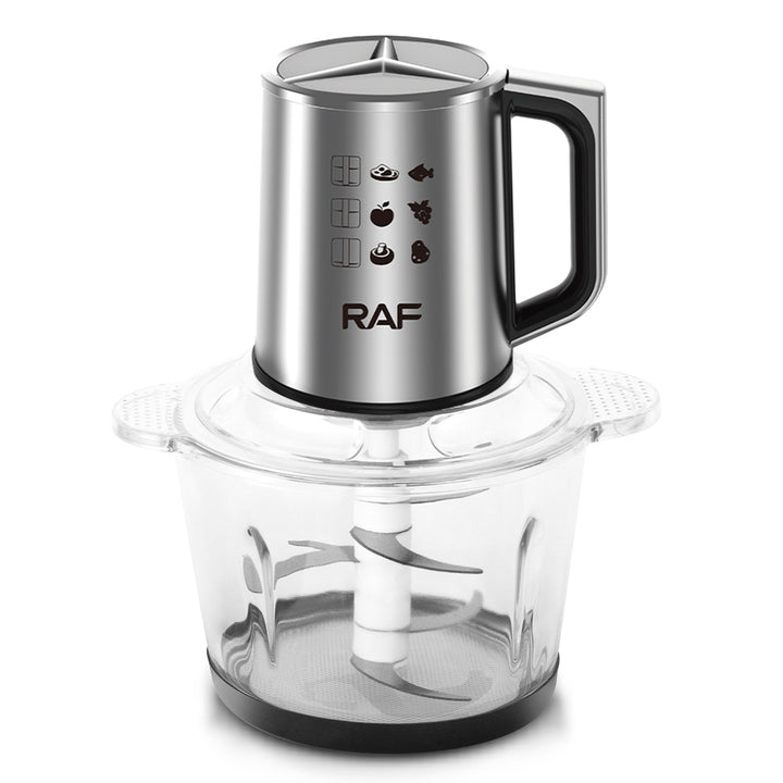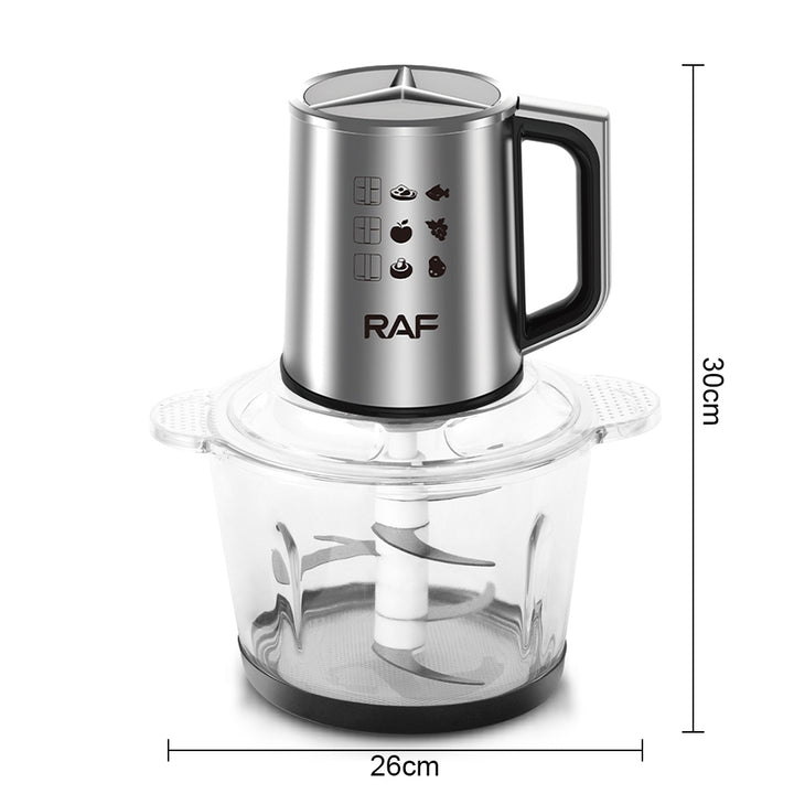 Prepare your meals effortlessly with the RAF Glass Chopper with Handle. Featuring 800 watts of power and a 3-liter capacity, it is perfect for chopping vegetables, fruits, and meat in suitable quantities for daily use. The transparent glass bowl lets you monitor the process easily, while the sturdy handle ensures convenience.