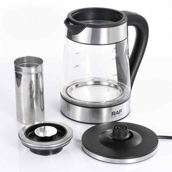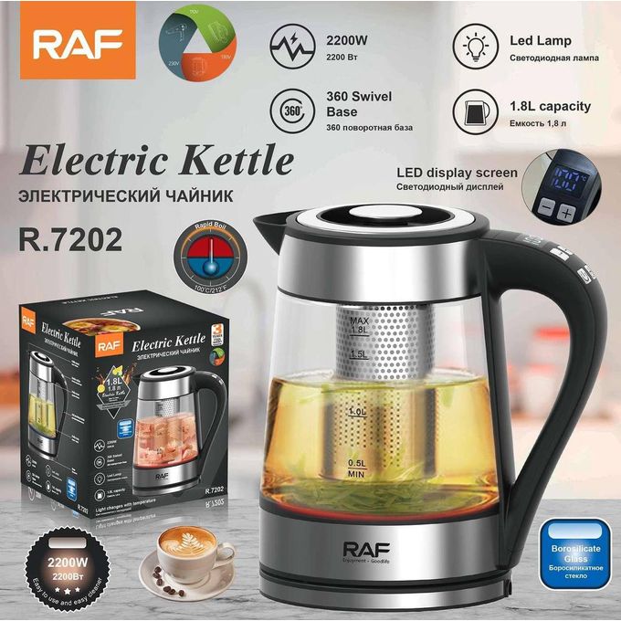 استمتع بغلي الماء بسرعة مع الكاتل الزجاجي من RAF المزود بتايمر. بقدرة 2200 وات وسعة 1.8 لتر، تعتبر مثالية تمامًا أو للاستخدام اليومي. تصميمه الأنيق بالزجاج الشفاف يتيح لك متابعة الغلي بسهولة، مع خامات عالية الجودة للسلامة وأداء طويل الأمد.