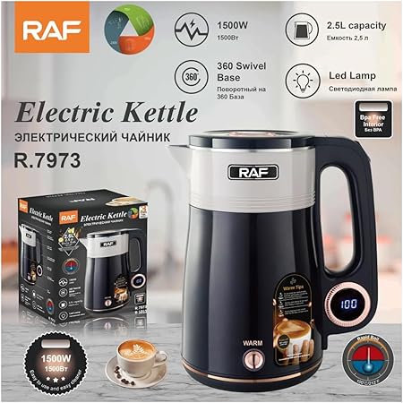 استمتع بغلي آمنة مع الغلاية الكهربائية RAF R.7973 رطل كبير 2 لتر وقوة 2000 وات لتوفير وقتك في تحضير الشاي، القهوة بسهولة.